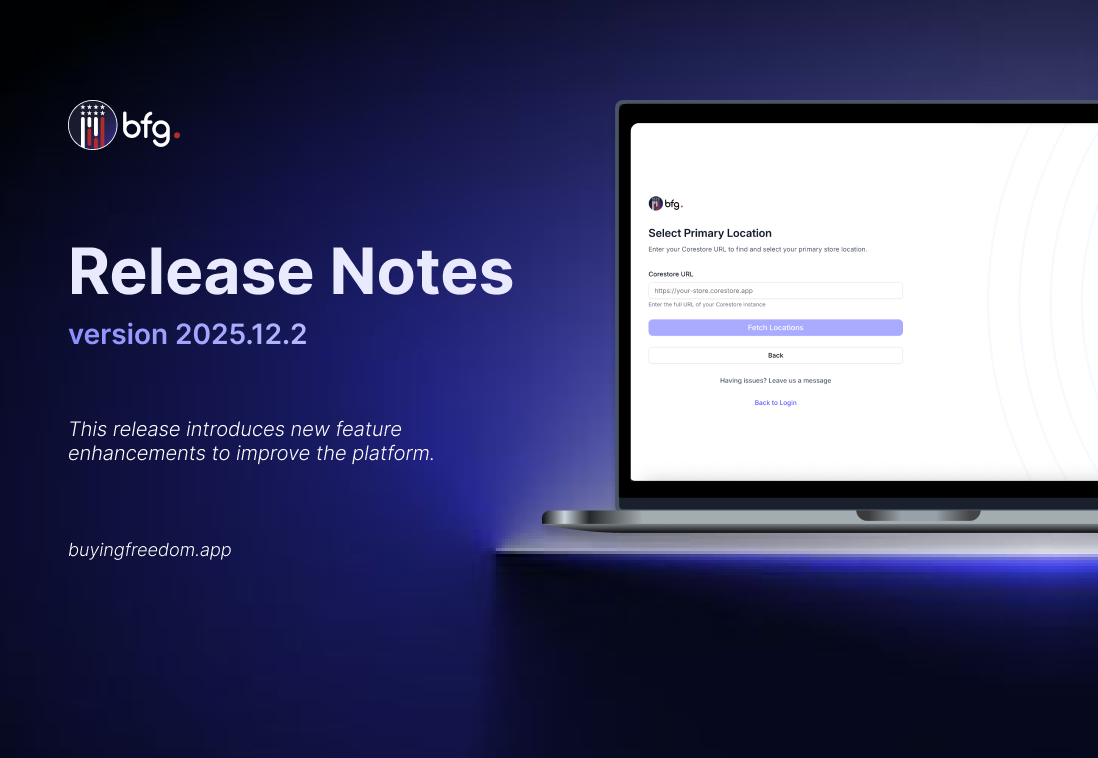 Stores can now register with their coreStore account. Users simply enter their coreStore URL, choose a primary location, verify their email, and the system automatically imports company and location information, including FFL data when available.