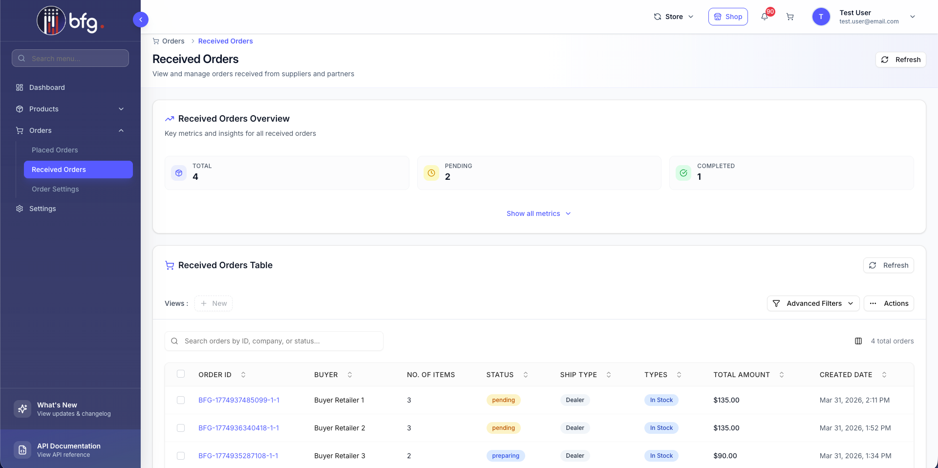 Retailer-as-sellers can view and manage received orders, track order status, and monitor sales.