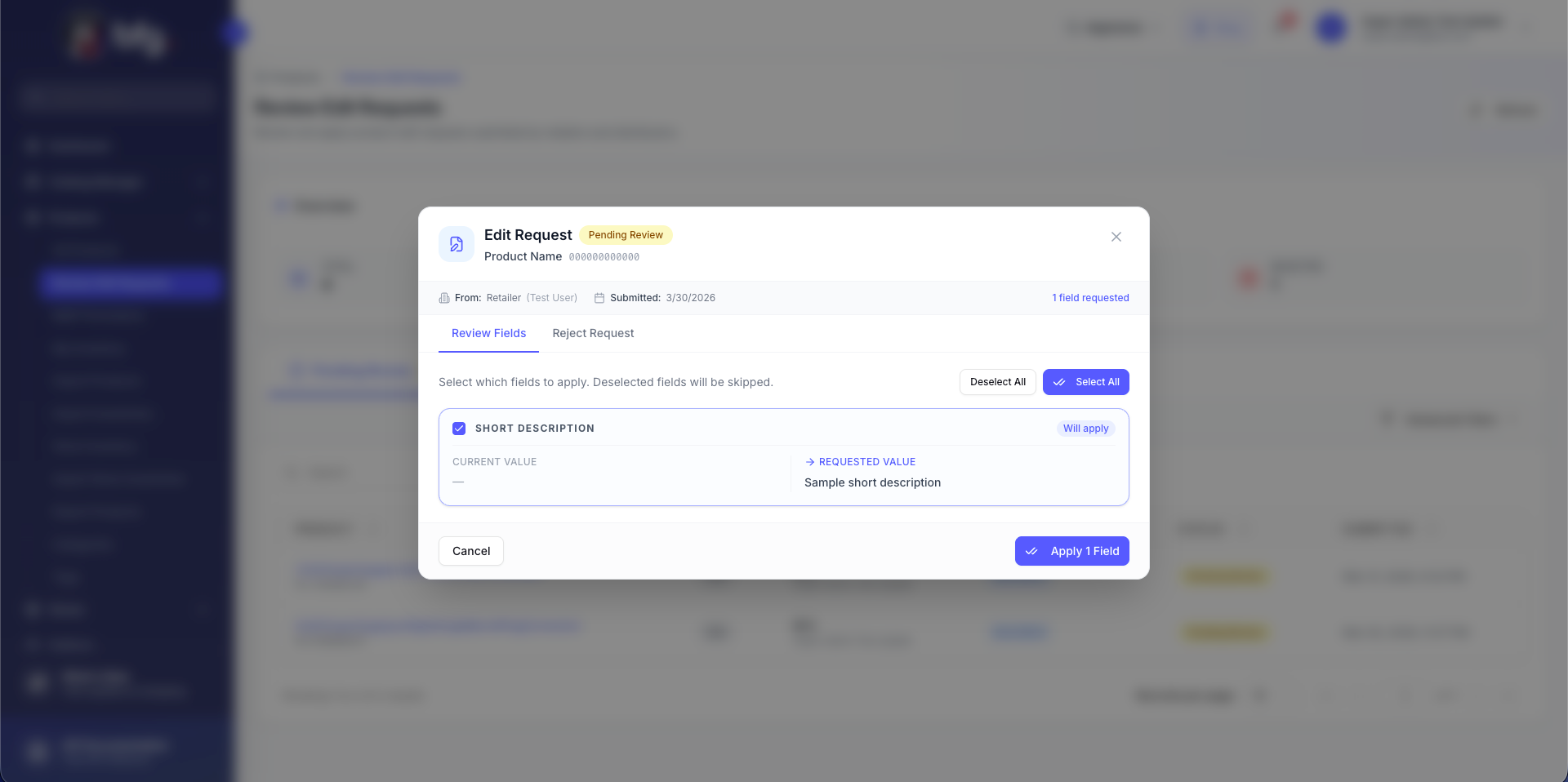 All edit requests submitted by retailers and distributors are listed on the Review Edit Requests page for manufacturers, who can review all pending requests and choose to apply or reject them, and they can also apply changes partially, updating only the selected fields.