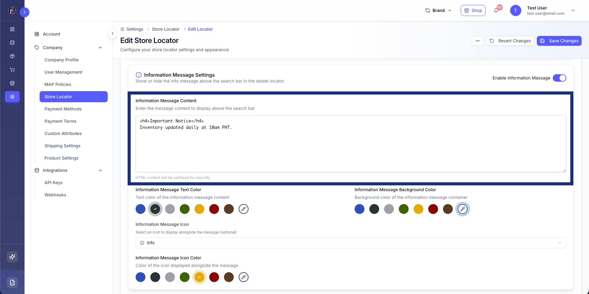 The Information Message field in the Product Locator now uses an HTML editor, replacing the previous basic text editor. This enhancement allows users to format content with headers, styled text, improving the clarity and presentation of information.