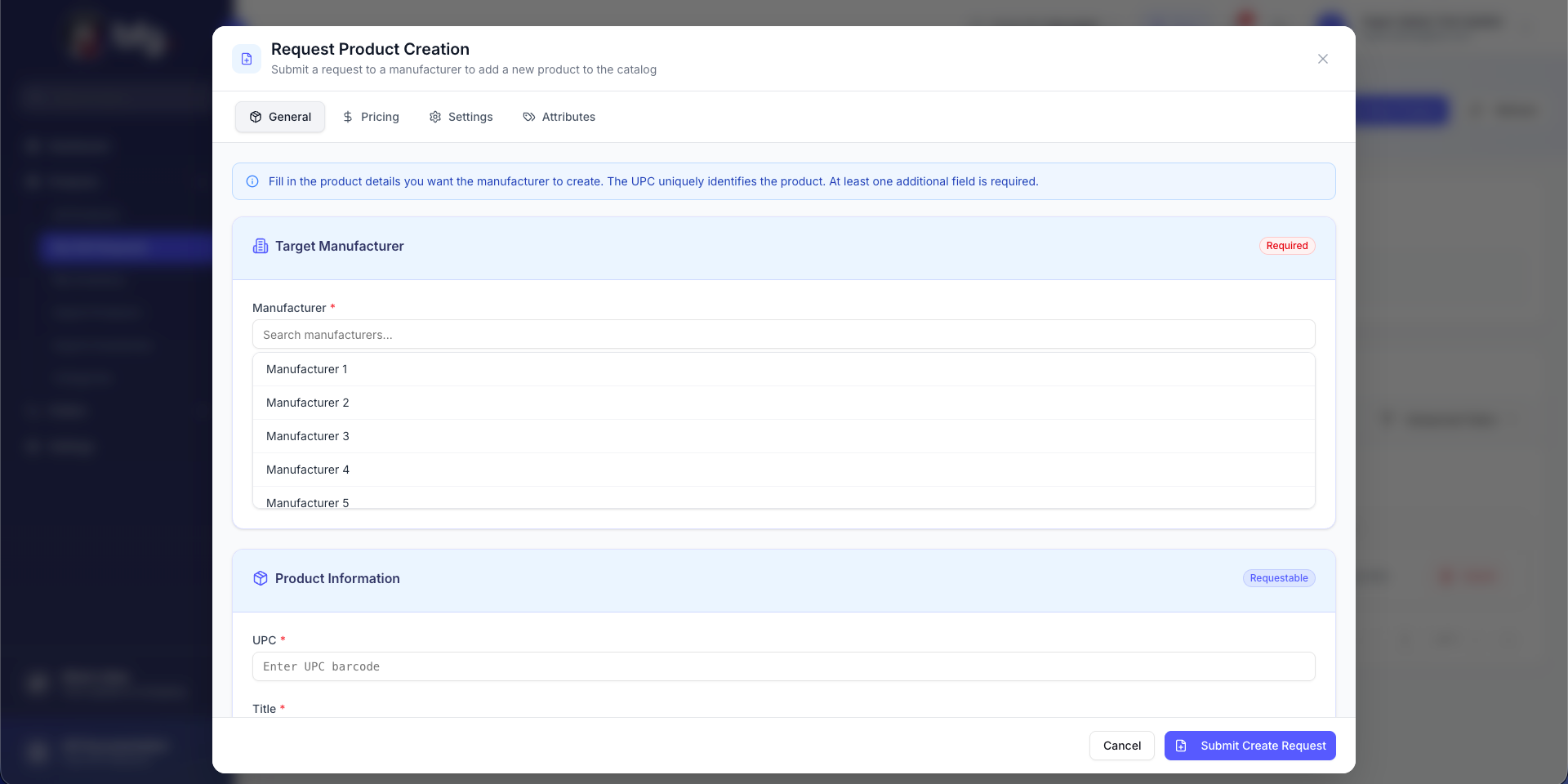 Distributors and retailers can now submit a Product Creation Request to the manufacturer to add new products to their catalog. This allows them to propose new items for inclusion, ensuring the manufacturer reviews and approves the product before it becomes available in their catalog.